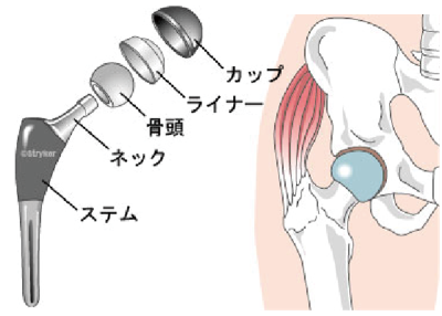 変形性股関節症や大腿骨頭壊死症、外傷などによる股関節の損傷に対して行います。手術では、損傷した股関節を金属やセラミック、ポリエチレン製人工関節に置き換えます。人工股関節は、大腿骨に埋め込むステム、骨頭あたるボール、臼蓋部分のカップとライナーの4つの部品で構成されています。